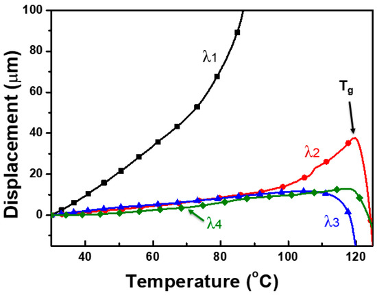 Dimensional stability is one of the most important parameters of polymer films for their various industrial applications, especially in the field of flexible electronic devices. The dimensional stability of the fabricated films was determined as their CTE behavior, and the results are shown in Figure 6. It is found that the thermal stability of the PCITN film improves with increasing λ. The least thermal expansion of PCITN film with λ4 indicates that it has the highest dimensional stability, which is due to the higher degree of molecular orientation in this film than other films. Just like conventional plastic films, novel PCITN films also show an undesirable dimensional change around Tg. This phenomenon can be attributed to the facts: (a) the molecular relaxation due to the increased mobility of polymer chains and (b) a rapid shrinkage or expansion due to the residual frozen stress within the stretched film structure. Compared to stretched films, the unstretched film expands abruptly around its Tg due to increased mobility of molecular chains. CTE behavior of the PCITN films was improved after uniaxial stretching. It can be attributed to the fact that the orientation of molecular chains is significantly improved with increasing λ. It is also reported by the previous researches that that increased molecular orientation improves the dimensional stability of the resultant films [40,41].