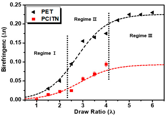 The birefringence can be used to evaluate the molecular orientation and relaxation phenomena of the polymer films. To analyze the orientation development during uniaxial cold-drawing of PCITN films, birefringence has been measured for drawn PCITN films, and the results in comparison with uniaxially stretched PET film [37] are shown in Figure 8. It can be seen from the results (Figure 8) that like PET film, PCITN film also exhibits three regimes during stretching. In the first regime, for λ values up to 1.0~2.5, birefringence increases linearly with increasing λ. In regime II, for λ values up to 3.0~4.0, a rapid increment in the birefringence is observed. In regime III (λ > 4), birefringence reaches its saturation where further stretching cannot cause a significant variation in birefringence. The birefringence results indicate how the molecular orientations are developed during the uniaxial stretching of PCITN. In regime I, the birefringence of isotropic and randomly-oriented films increases linearly with increasing λ due to the steady growth of molecular chains along the stretching direction. An abrupt increment of birefringence in regime II is attributed to the development of SIC phases and the reduction of amorphousness of the stretched films. In regime III, birefringence reaches its saturation due to the achievement of maximum alignment polymer chains. Our results for the birefringence are also supported by the previous research works [37,42]. Our research indicates that novel PCITN film with lower birefringence can be used as an alternative performance material to conventional PET and PEN films for optical applications (PEN > PET > PCITN) [43].