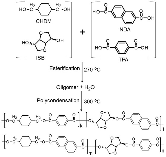 TPA (99.9%), ISB (99.8%), and CHDM (99.8%) with 70 mole% trans-isomers were purchased from SK Chemicals (SKC; Suwon, Korea). NDA (99.8%) was purchased from BASF (Ludwigshafen, Germany). The ultra-pure (99%) catalyst (titanium-N-butoxide (TNBT) and thermal stabilizer (phosphorous acid) were used as received from Sigma Aldrich (Soul, South Korea). The high-purity monomers were used as received. High purity (99.9%) solvents, like deuterated chloroform (CHCl3-d) (Sigma Aldrich, Soul, South Korea), deuterated trifluoroacetic acid (TFA-d) (Sigma Aldrich, Soul, South Korea), and o-chlorophenol (Sigma Aldrich, Soul, South Korea) used for the characterization of specimens, were used as received without any further purification.
