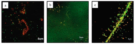 Confocal Laser Scanning Microscopy images of E. coli attached to glass (a) to ppOct (b) and to ppAAc (c) after 18 h of incubation at 37 °C. Bacteria were stained using LIVE/DEAD® BacLightTM Bacterial Viability kit. Green cells are considered alive, and red cells are considered dead. Reprinted with permission from []. Copyright 2015, American Vacuum Society.