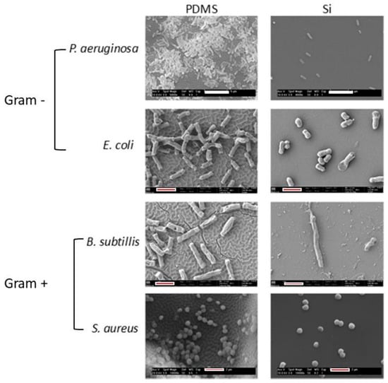 SEM micrographs of the polyamide thin film deposited onto PDMS and Si after the incubation with bacterial strains in solid medium (white bars = 5 μm; red & white bar = 2 μm). Reprinted from [], published by MDPI.