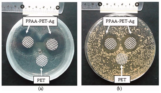 In a study conducted by Pishbin et al., Ag NPs were encapsulated into a composite formulation of chitosan and bioactive glass to coat 316 stainless steel samples, by a single-step electrophoretic deposition (EPD), for orthopedic applications []. Besides helping to avoid the initial burst release, the encapsulation of the nanoparticles also hinders possible environmental hazards associated with the release of Ag NP. However, although the coatings proved to be efficient towards S. aureus up to 10 days, the concentration of Ag NPs revealed to be cytotoxic to osteoblast-like cells up to 7 days []. Further studies are proposed in order to refine the correct concentration of the Ag NP. In a different approach, the antimicrobial ability of PET coated and uncoated surfaces was evaluated against bacteria. Herein, PET meshes were coated with a polyacrylic acid/Ag NPs formulation by a plasma polymerization technique []. Before the coating procedure, the Ag NPs were entrapped into the polyacrylic acid polymeric network. After 24 h, the coated meshes presented a visible inhibition halo towards S. aureus and E. coli compared to the uncoated PET mesh (Figure 4).