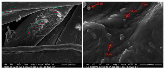 SEM micrographs of cotton fabric coating with ZnO/chitosan coating. In the right image the arrows show the size of the ZnO nanoparticles. Reprinted with permission from []. Copyright 2016 American Chemical Society.