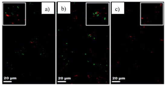 Live and dead bacteria on Cu-PES samples: (a) t = 0; (b) t = 30 min; (c) t = 60 min (low intensity light irradiation). Reprinted from [], with permission from De Gruyter.
