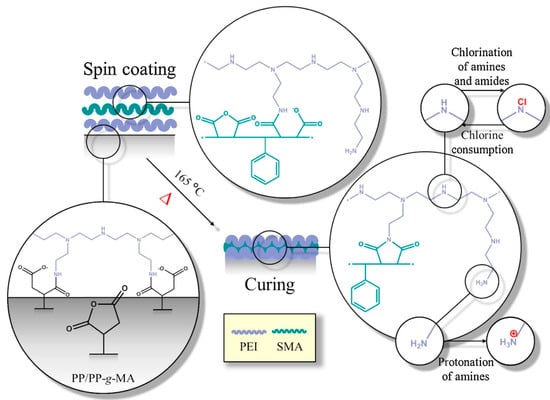 The preparation of a self-healing antimicrobial polymeric coatings is reported in the literature. In a work, using a spin coating technique, multilayers of PEI and styrene maleic anhydride copolymer (SMA) were deposited onto PP-based substrates and then cured, as shown in Figure 9 []. Due to the composition of the coating, it was possible to tune several properties. The hydrophobic character was conferred by the styrene subunits, while the antimicrobial potential was related to the cationic primary amine groups and chlorination of N-halamine formed groups. As a result, the coatings maintained their antimicrobial activity even when increasing the organic load conditions of E. coli. In addition, the coatings proved to have self-healing properties, after exposure to both acid and alkaline surrounding media, by being able to restore their characteristic chemical bonds under heat [].