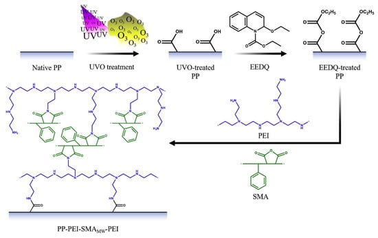 The same group investigated the antimicrobial potential of PEI/SMA multilayer coatings on PP based substrates with the variation of SMA molecular weight []. Furthermore, the storage stability was also evaluated. Before coating, the PP substrates were activated in order to enhance the binding of the coating. Square substrates were exposed to UV-Ozone irradiation (UVO) to promote the formation of carboxylic acid groups by a photo-oxidation reaction. Then, to create anhydride groups on its surface, the substrates reacted with 2-ethoxy-1-ethoxycarbonyl-1,2-dihydroquinoline (EEDQ). This step intended to turn the surface of the PP substrate more reactive when in contact with the primary amine groups of PEI. The activation and coating of PP substrates are represented in Figure 10.