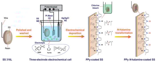 The preparation of PPy coatings with both antimicrobial and electrical properties was suggested elsewhere []. PPy was deposited on stainless steel substrates by an electrodeposition technique. However, to activate the antimicrobial effect of PPy, after the deposition, the prepared coating was treated with chlorine bleach. As a result, the final coating was a N-halamine based PPy (Figure 11).