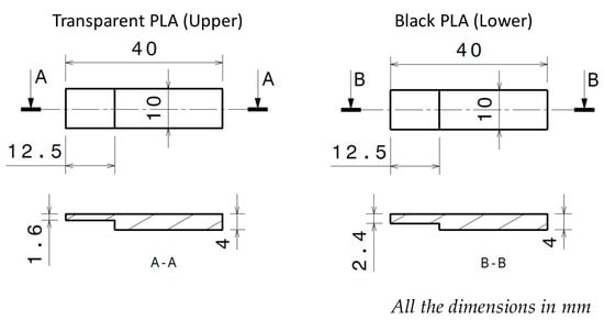 Two different parts were designed with the dimensions shown in Figure 1 to optimize the welding ability of the process, maintaining an overlapping area between upper and lower probe. In addition, to facilitate the light transmission through the upper part, focusing the beam energy on the contact area of the joining probes, transparent PLA tonality was used for the manufacturing of the upper part and black PLA for the lower part.