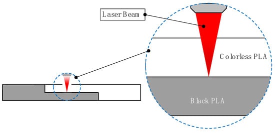 The laser joining process of the printed parts was carried out by the irradiation of a 5 × 5 mm area focused on the overlapping interface between the colorless and black probes, as shown in Figure 2. All irradiation processes were performed using a 20 W ytterbium-fiber infrared laser system (ROFIN-SINAR Technologies Inc., Plymouth, MI, USA). Spot diameter and pulse width were 60 µm and 100 ns, respectively.