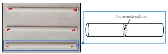 In order to estimate the range of the parts that can be replaced by joined sets, a new type of test probe was designed based on the size of 100% density fill of PLA cylindrical parts. These probes were developed to calculate the equivalent cross-sectional area of a cylindrical part that can ensure the maximum tensile strength of laser irradiation joining. Taking as reference the printing parameters of the joining samples, the variation in the cross-sectional area of the cylindrical elements was taken as the control parameter to evaluate the maximum tensile strength behavior as a function of the size of the printed samples (Figure 3). Manufacturing parameters of equivalent section cylindrical parts are shown in Table 3.