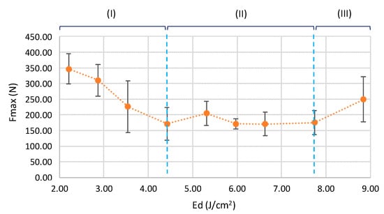 The energy density of pulse (Ed) was considered as control parameter for the application of laser radiation treatments in the joining process. Increasing the Ed on the joining area results in the development of three different behavior ranges of joined parts as a function of the tensile strength. Each range is mainly characterized by a behavioral trend that provides specific characteristics to the joining process. As shown in Figure 4, these trends were easily detected by a tensile test of the joined samples, where the values of maximum strength (Fmax) and maximum deformation (Dmax) were affected.