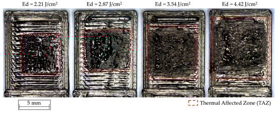 As described previously, more aggressive treatments with higher Ed values are associated with a greater incidence of the laser beam on the contact surface between the parts to be joined. As a consequence of the radiation energy supplied, a significant increase in the area of molten material considered as TAZ is caused in the lower sample, as shown in Figure 5.