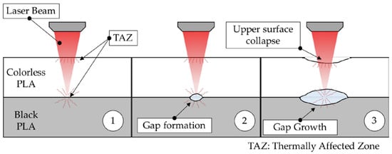 This behavior is also associated with an increase in the depth of incidence of the beam on the lower sample, which causes the collapse of the surface and the formation of a crater. The location of the focus point of the laser beam between lower and upper joining probes also induces radiation heat transfer to each surface, resulting in deformation towards the internal layers of the black and colorless samples, as shown in stage 1 of Figure 6. The increase in the supplied energy (Ed) leads to the growth of the generated gap, reducing the joined section to the outside edge of the irradiated areas, as shown in stages 2 and 3 of the Figure 6. These increases in the size and depth of craters cause a decrease in the effectiveness of the bonding zone between PLA surfaces, thus decreasing the tensile Fmax.