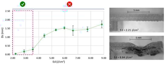 Upper surface collapse by the irradiation effect causes a deformation that can be considered as a quality requirement to validate the use of the technology. Under this consideration, the supplied energy, in terms of the energy density of the pulse of the laser treatment, shows a significant influence in the deformation of the upper surface of the joined parts. In this case, it has also been observed that increases in energy density per pulse result in greater deformation of the irradiated section, showing a critical growth from 3.54 J/cm2, as shown in Figure 7.