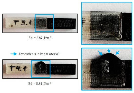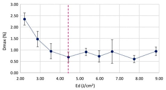 In addition to deformation phenomena on the thermally affected surfaces, the laser irradiation process may affect the printing structure of the PLA, with varying mechanical properties from the initial parts. The melting and cooling process of the overlapping samples interface modify the internal printing structure of each parts, mainly based on the variation in fill density on located sections (irradiated area). One of the main consequences of the variations in the internal structure of small sections is a reduction in the tensile maximum deformation (Dmax), measured by a tensile testing machine. This effect is magnified when increasing the melted material volume. Based on this consideration, a significant reduction (>220%) in the maximum tensile deformation until the failure of the joined part has been detected, as a function of the supplied energy (Ed). This reduction is maintained in a uniform range for Ed values over approximately 4.42 J/cm2, where critical volume of the melted material causes a similar behavior in the joined samples, as shown in Figure 8.