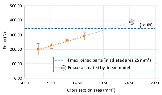 The increasing behavior of Fmax as a function of part section (A) is governed by the linear model of Equation (1), showing a determination coefficient (R2) higher than 99.9% that ensures the goodness of the adjustment. Based on the linearity of the tensile strength behavior as a function of the area of printed sections, the Fmax of equivalent irradiated area (5 × 5 mm = 25 mm2) was calculated to validate the experimental assumptions. As a result, a variation lower than 10% was confirmed between the calculated Fmax of the equivalent sections, of full density fill printed parts, and the Fmax value of the joined parts that fits with the joining conditions of Ed = 2.21 J/cm2.