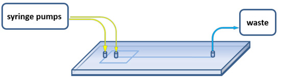 In experiments and measurements e.g., contact angles we used polycarbonate plates (Makrolon, Bayer) of sizes 40 × 20 × 0.75 mm. We fabricated the microfluidic chips in polycarbonate by micromilling (Ergwind MSG4025, Sopot, Poland) in plates of thickness of 5 mm and then bonded them with plane 2 mm plates. In the procedures of PC chips modification we used syringe pumps (PHD 2000, Harvard Apparatus, Holliston, MA, USA) (Figure 1). The microchannels were modified with the use of 20% NH4OH for 2 h with flow rate equals 6 mL h−1 and then were rinsed with water for 30 min with the same flow rate. The flow rate of ammonia solution has a negligible impact on the quality of smoothing and hydrophobization. Still, we noted that: (i) too slow flow may result in the undesirable emission of ammonia gas bubbles, and (ii) too fast flow causes excessive consumption of reagent. For this reason, we considered the flow of 6 mL h−1 to be optimal.