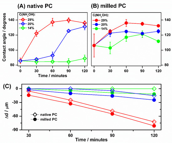 Contact angle of water on polycarbonate modified in ammonia solution with various concentrations (14—green, 20—blue and 29%—red) in the function of time of exposure for native PC (A, diamonds) and completely milled PC slabs (B, circles). The values of the contact angle are the averages of three measurements. (C) Effect of the ammonia solution concentration and duration of modification of native PC (diamonds) and completely milled PC slabs (circles) in the function of thickness of removed layer of PC surface.