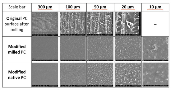 The supplementary materials are available online at https://www.mdpi.com/2073-4360/12/11/2490/s1, Figure S1 UV-VIS transmission spectra of the milled (A,B) and native (C,D; untreated) PC plates modified via exposure to 14 (A,C) and 29% (B,D) solution of NH4OH for 2h at room temperature; Figure S2 Scanning electron microscopies of milled PC slabs that were modified with the use of various solutions of NH4OH for various times at room temperature; Figure S3 Scanning electron microscopies of native PC slabs that were modified with the use of various solutions of NH4OH for various times at room temperature.