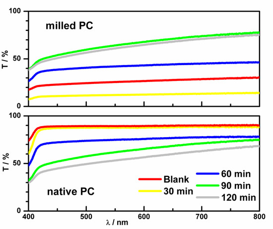 We assume that the optimum treatment should smoothen the surface yet leave the cross-section of the channel unmodified. For this reason, in further analysis our attention has been focused on PC modification with the use of 20% ammonia solution for 2 h, as it digests only about 15 or 25 micrometers of the native and milled PC surface, respectively. In Figure 4 we presented the results of spectral analysis for PC slabs that were modified with 20% NH4OH in different time. As shown in Figure 4 and Figure 5, the chemical modification caused the significant increase of optical transparency for the milled PC (with machined structures) and a slight decrease for native PC. It is worth highlighting that the initial transparency difference for the PC native and milled surfaces disappeared after the proposed PC modification. Nevertheless, the transparency of all types of PC surfaces after modification with the use of 20% NH4OH for 2 h is similar, just as we observed that the CAs did not differ between the originally native or milled surfaces after treatment (Figure 2). Additionally, we showed data sets of the spectral analysis of PC plates for other concentrations of NH4OH (14 and 29% in Figure S1 and Figure 5).
