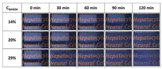 In general, the PC transparency can be altered with the use of NH3(aq) treatment and increased with concentration of the reagent and/or reaction time (Figure 5). There is a very tight correlation between these two parameters and the optical transparency of the modified PC and using a higher NH3(aq) concentration (from 14 to 29%) shortens the time of modification (from 120 to 30 min).