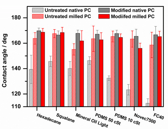 Furthermore, in order to verify the applicability of the modified PC surfaces to formation of droplets in microfluidic devices, we measured the contact angle of water drops deposited on the modified slabs in the continuous phase of various oils (Figure 6).