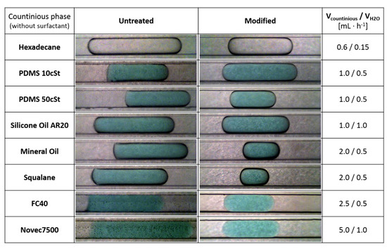 Further, we verified the utility of microchannels modified under optimal conditions for production of water droplets in various oils continuous phase (Figure 7). We tested the formation of water droplets in various oils (hexadecane, Squalane, PDMS, Silicone, and Mineral Oils) or fluorocarbon oils (FC-40 and Novec7500).