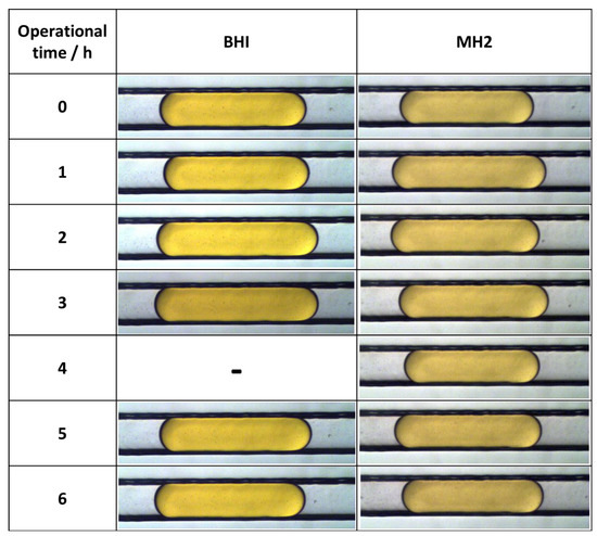 Finally, we confirmed the stability of the generation of droplets of media for bacterial growth (BHI and MH2) in a flow-focusing microfluidic device modified with NH3(aq) (Figure 8). The liquid bacterial media, which contain nutrients and physical growth components, have very complex chemical compositions and can significantly affect wetting effects. We continuously produced droplets of BHI and then MH2 for the minimum total time of 6 h. We did not observe any changes over time in the quality of the produced droplets.