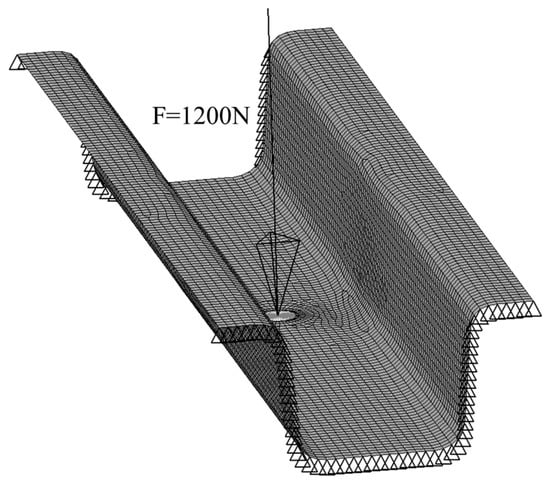 In this model, there are several hanging beams under the floor; after distributing the weight of the battery pack to each hanging beam, the average static load applied on a single hanging beam is 200 N. When 5 times the gravity acceleration is taken as the safety factor of the battery-hanging beam, then 6 times the gravitational force should be applied to the bolt in the center of the battery-hanging beam, so 1200 N force will be applied in the vertical direction. In fact, the floor does not bear the main load; instead, the floor girder and battery-hanging beam are the main load-bearing structures. The hanging beam mainly relies on the connection with the floor girder to transmit loads. Therefore, both sides of the battery-hanging beam are fully clamped in the finite element model, as shown in Figure 2.