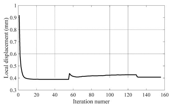 where denotes the vector of design variables at the δth iteration and (=0.001 here) is the prescribed convergence tolerance.