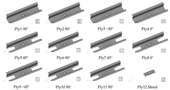 Four candidate ply orientations (−45°, 0°, 45°, 90°) were selected for the optimization problem for easy fabrication of CFRP. The battery-hanging beam is the connection structure between the floor and battery packs, and they are usually connected by bolts. In order to prevent the composite battery-hanging beam from failing at the position of the bolts, another choice of metal reinforcement plate was provided as a candidate material on the outermost layer of the structure, i.e., the location between the screw nut and the laminated battery-hanging beam. This section describes the simultaneous topology optimization of the metal plate and CFRP beam. Moreover, thickness topology optimization and orientation optimization of CFRP material were also conducted at the same time. Apart from the four CFRP orientations on the outermost layer, the metal plate was considered as the fifth candidate material. The material parameters for CFRP composites and metal (Q235) are summarized in Table 1 and Table 2 [36], respectively.