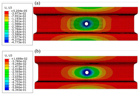 Deformation contour: (a) deformation of CFRP structure after postprocessing; (b) deformation of original steel structure.