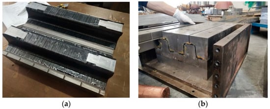 CFRP laminates on the molds and the closed molds: (a) laying up the prepreg; (b) closing the molds.