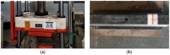 Firstly, all possible contaminants on the surfaces of the molds were wiped with chemical cleaner. The release agent was applied on the molds to prevent the CFRP laminates from sticking to the surfaces. CFRP laminates were laid on the molds layer by layer, and the sequence of the layer orientations was according to the optimization results, as shown in Figure 7a. After placing the concave die onto the punch die in a frame, some wedge blocks were inserted in the gap between the frame and the molds because the female die and the punch needed be compacted well, as displayed in Figure 7b. Finally, the frame with the CFRP structure inside was heated and pressed on the four-column hydraulic machine, as shown in Figure 8a; the final prototype is presented in Figure 8b. In order to ensure good repeatability of the subsequent testing, three samples were manufactured.