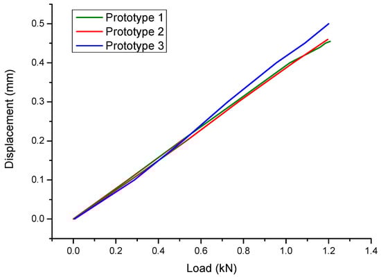 To test whether the finite model for the optimal design was correct and accurate, the experimental tests of the prototyped battery-hanging structure were conducted, as shown in Figure 9. In the experimental tests of the three samples, the displacements at the loading point under specific load were measured. Figure 10 gives the relationship between the load and the displacement of the three samples, and Table 3 compares the results from the experimental tests and numerical simulation. Obviously, the repeatability of the test was acceptable and the FE simulation was accurate enough, which demonstrates that the topology optimization of the CFRP-laminated battery-hanging structure is effective.