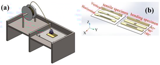 Schematic diagram of the FDM (Fused Deposition Modelling) experiment plan: (a) shows the principle diagram of the FDM printing device and (b) shows the different printing direction and path of the tensile and bending specimen: horizontal and vertical represent the printing direction; 45°, 90°, and 180° represent the printing paths, which means the angles between the nozzle moving direction and the Y-axis are 45°, 90°, and 180°, respectively.