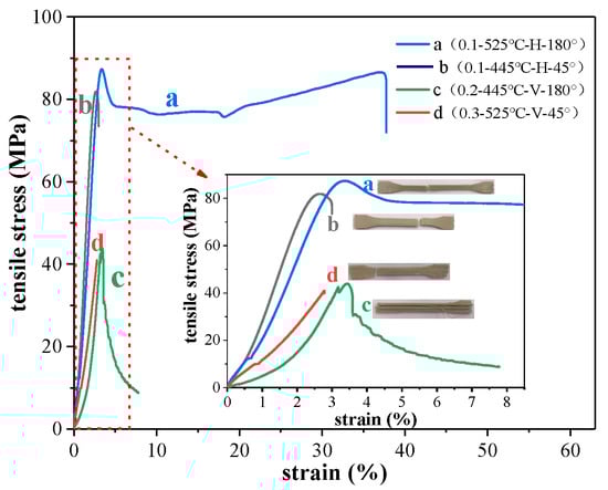 Stress–strain diagram and tensile fracture diagram of tensile specimen (where a represents 0.1–525 °C–H–180°; b represents 0.1–445 °C–H–45°; c represents 0.2–445 °C–V–180°; d represents 0.3–525 °C–V–45°).