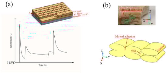 (a) The temperature change law at X node of FDM prints with time; (b) schematic diagram of the porosity of the fracture cross section.