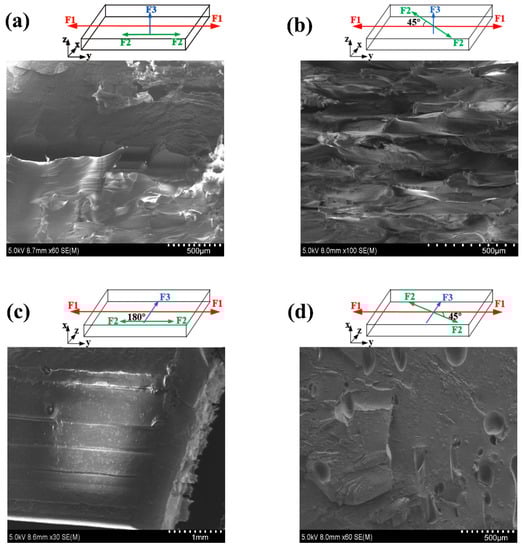 The fracture mode of the tensile specimen and the corresponding SEM tensile fracture morphology (a) 0.1–525 °C–H–180° ductile fracture; (b) 0.1–445 °C–H–45° semi-brittle fracture; (c) 0.2–445 °C–V–180° interlayer debonding (d) 0.3–525 °C–V–45° brittle fracture. (F1 represents the direction of tensile force; F2 represents the printing path; F3 represents the printing direction).