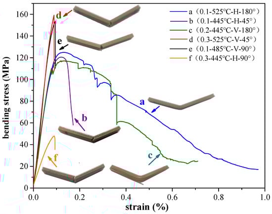 Stress-strain diagram and bending fracture diagram of the bending specimen (where a represents 0.1–525 °C–H–180°, ductile fracture; b represents 0.1–445 °C–H–45°, semi-brittle fracture; c represents 0.2–445 °C–V–180°, interlayer debonding; d means 0.3–525 °C–V–45°, brittle fracture; e represents 0.1–485 °C–V–90°, brittle fracture; f means 0.3–445 °C–H–90°, brittle fracture).