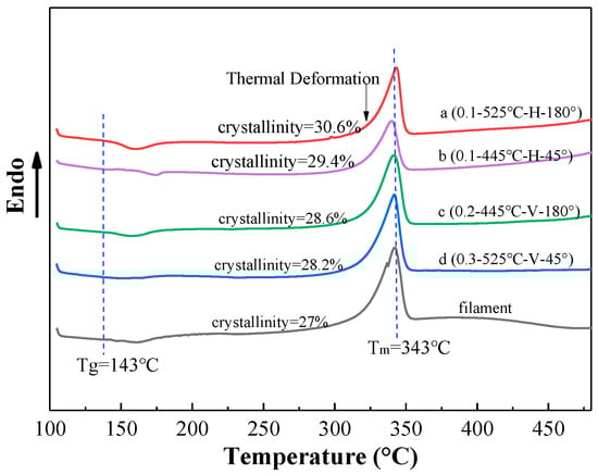 As shown in Figure 6, the crystallinity of sample a (0.1–525 °C–H–180°) is higher than that of sample b (0.1–445 °C–H–45°), and the tensile strength and plasticity of sample a are all better than sample b (Figure 2). This indicates that the crystallinity of the material is positively related to the tensile strength of the sample and if the printing direction is the same, the sample with higher crystallinity has better plasticity. The reason for this is that when the printing path is 180°, the force direction of the sample is the same as the horizontal in the direction of each filament, and the filament is fully melted at high temperature, making the crystal more uniform resulting in the tensile strength and plasticity being better. Similarly, after comparing the performance of sample c (0.2–445 °C–V–180°) and sample d (0.3–525 °C–V–45°), it was found that the sample with higher crystallinity had higher tensile strength and plasticity.