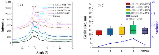 As shown in Figure 7b, the grain size in the samples under different printing parameters differs by 10–50 nm. To reflect the uniformity of the distribution of the grain size, the difference between the maximum value change of the grain size was determined and the analysis of the size variance conducted for each set of printing parameters. The smaller the difference, the smaller the size change, and the smaller the change, the higher the uniformity of the grain size, all which improve the mechanical properties of the sample.