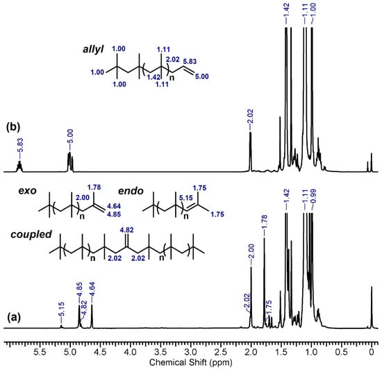 Figure 1. 1H NMR spectra of the exo-olefin-ended (a) and allyl-terminated polyisobutylene (b).