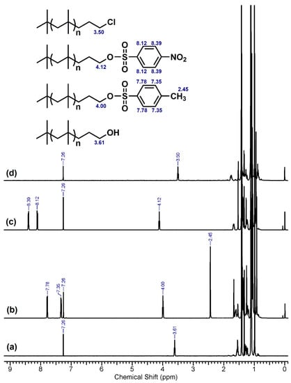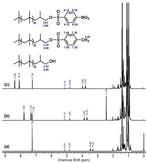 The first attempts on tosylation of PIBexo-OH were carried out to reproduce previously described experiments [47] by applying the same reaction conditions (DCM solvent, 2 eq. of TsCl, 2 eq. of DMAP, 13.7 eq. of TEA, room temperature, 10 h reaction time). However, surprisingly these conditions did not lead to full conversion of the PIBexo-OH. Therefore we tried also pyridine instead of DMAP, different TsCl concentrations and various reactions times (Entry 1–3 in Table 1). As shown in Table 1, pyridine alone is not sufficiently effective catalyst of tosylation, leading only to 16% conversion. As the data indicate in Table 1 and in Figure 2, tenfold excess of TsCl in the presence of 2 eq. DMAP and 10 eq. TEA leads to complete transformation of the hydroxyl groups in PIBexo-OH to PIB with tosyl endgroups (PIBexo-OTs), even with relatively short reaction time of 7 h (Entry 5 in Table 1). This reaction time is sufficient to reach only 80% conversion during nosylation under the otherwise same condition, but using THF as solvent, as shown in Table 2 (Entry 11). Because the nosyl chloride has limited solubility in DCM, all nosylation reactions were carried out in THF, which is an appropriate solvent for both NsCl and PIB. Longer reaction times of nosylation of PIBexo-OH lead to ~90% conversion, i.e., to the formation of nosyl ended polymers (PIBexo-ONs) as indicated by the 1H NMR spectrum in Figure 2.
