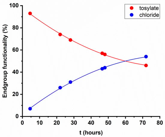 The results of the experiments on the sulfonylation of PIBexo-OH indicated that 10 eq. of the alkyl sulfonyl chloride with the combination of 2 eq. DMAP and 10 eq. TEA results in complete transformation of the hydroxyl group for tosylation and nearly complete conversion for nosylation. Because the PIB-Exo has an extra methyl group connected to the chain terminus compared to the lack of such substituent in the allyl endgroup of PIB-All, it was expected that the latter one has higher reactivity than PIBexo-OH. However, using smaller excess of tosyl chloride, that is, only 2–5 eq., for the tosylation of PIBall-OH resulted in only partial conversion even with longer reaction times as shown in Table 3 (Entry 15–18), on the one hand. On the other hand, alkyl chloride chain end appeared at long reaction times (72 h). Thus, experiments with tenfold excess of TsCl reagent were carried out by using the same reaction conditions as for PIBexo-OH with reaction times from 4.5 h to 72 h (Entry 19–24 in Table 3). These experiments led to interesting results. First, the transformation of the alcohol chain end is much faster with PIBall-OH, i.e., the reactivity of PIBall-OH is higher than that of PIBexo-OH with TsCl as expected. Second, not only tosyl endgroups but PIBs bearing a terminal primary chlorine group (PIBall-Cl) as side products were also observed as indicated by the signal at 3.50 ppm in the 1H NMR spectra which is assigned to the methylene group next to the chlorine termini (Figure 3). Furthermore, the amount of PIBall-Cl is increasing, while the amount of tosylated PIB is decreasing with the reaction time as shown in Table 3 (Entry 19–24) and in Figure 4. Therefore, the occurrence of the following processes can be considered to take place according to results with low MW compounds [39] under the applied conditions as depicted in Scheme 2: (1) the initial reaction of the alkyl sulfonyl chloride with the alcohol yields the main tosylated product, (2) meanwhile the HCl byproduct forms triethylammonium hydrochloride (TEA*HCl) with TEA, in which the chloride ion has a sufficient nucleophilicity to displace the alkyl sulfonyl group. As a consequence, as can be seen in Scheme 2, the first substitution step, i.e., tosylation, is followed by substituting the tosyl group, which is a good leaving group, with chlorine.