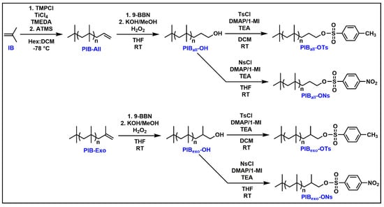 Scheme 1. The synthesis routes for the preparation of tosyl- and nosyl-ended polyisobutylenes derived from exo-olefin-ended (PIB-Exo) and allyl-terminated (PIB-All) polymers (PIB-All was obtained by quasiliving carbocationic polymerization).
