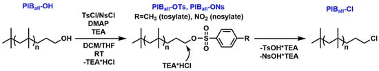 Based on the current literature, very limited knowledge exists on PIBs with sulfonate (tosylate, nosylate, mesylate) endgroups. In an early attempt, linear and three-arm star PIB-OHs were tosylated with excess TsCl in the presence of DMAP and TEA as bases in dichloromethane (DCM) [47]. Although complete consumption of the hydroxyl groups was claimed, detailed analysis of the products was not carried out. However, it was found that using these tosylated PIBs as macroinitiators for the quasiliving cationic ring-opening polymerization (CROP) of 2-methyl-2-oxazoline resulted only in 70–80% blocking efficiency, indicating incomplete initiation of the CROP process by the chain ends, which might be an indication of incomplete tosylation. As found by us recently [48] and during our preliminary experiments, lower than quantitative endfunctionalization was achieved by reacting TsCl with PIB-OH under similar conditions as reported [47]. Converting the hydroxyl group of PIB-OH prepared from industrial PIB-Exo by methanesulfonyl chloride (mesyl chloride, MsCl) led to mesylated PIB, which was used as an intermediate for polyisobutylene supported catalyst systems [49,50]. However, detailed analysis of this process and the resulting polymers or the average endfunctionality has not been reported in the case of these sulfonylations.