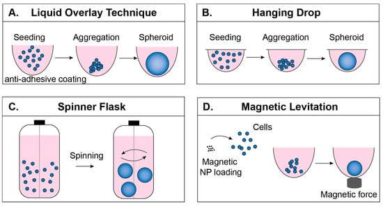 Matrix-free formation techniques. (A) In the liquid overlay technique (LOT), cells are seeded onto a surface that prevents adhesion, encouraging cell–cell adhesion. (B) In the hanging drop technique, cells are suspended in drops from the underside of a culture plate lid. (C) In the spinner flask technique, rotational motion encourages cell–cell adhesion. (D) In the magnetic levitation technique, cells take in magnetic nanoparticles and are aggregated by magnetic force.