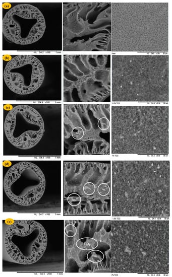 Scanning Electron Microscopy (SEM) pictures (cross and exterior surface) of polyvinylidene fluoride (PVDF) membranes made from separate levels of TiO2: (a) 0, (b) 0.5, (c) 1.0, (d) 1.5, and (e) 2.0 wt% in the presence of polyvinyl pyrrolidone (PVP).
