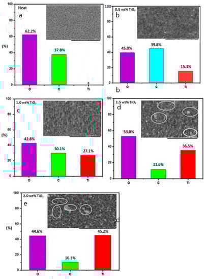 Figure 2 shows the SEM and elemental composition of membranes made from the different dosages of TiO2—0, 0.5, 1.0, 1.5, and 2.0 wt%, respectively—in the presence of the PVP additive. The neat membrane has only oxygen and carbon in the elemental composition. Membrane accreted with 0.5 wt% TiO2 dosage displayed elemental composition of 45% C, 39.8% O, and 15.3% Ti. It was observed that the Ti percentage in the elemental composition increased with an increase in TiO2 dosage in the dope. Ti composition increases from 15.3% to 35.5%. However, at higher loading of TiO2 (2.0 wt%), the O compositions were reduced to 44.6%. As depicted in Figure 2, 0.5 and 1.0 wt% TiO2 loading present a free agglomeration. In contrast, membranes with 1.5 and 2.0 wt% TiO2 loading display heterogeneous dispersion and clustering of particles, which led to agglomeration and an increase in viscosity in the dope [50].